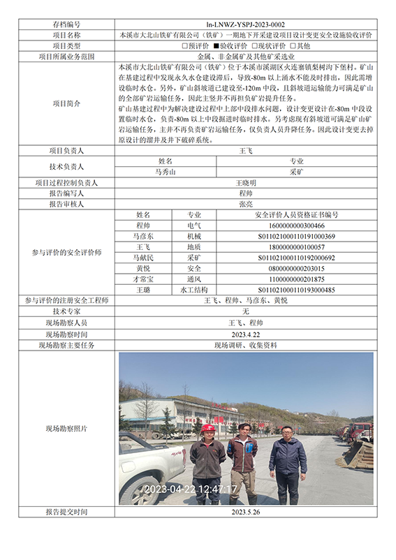 本溪市大北山铁矿有限公司(铁矿)一期地下开采建设项目设计变更安全设施验收评价