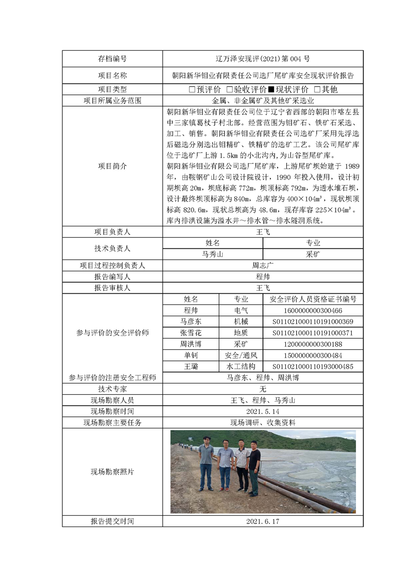 朝阳新华钼业有限责任公司选厂尾矿库安全现状评价报告