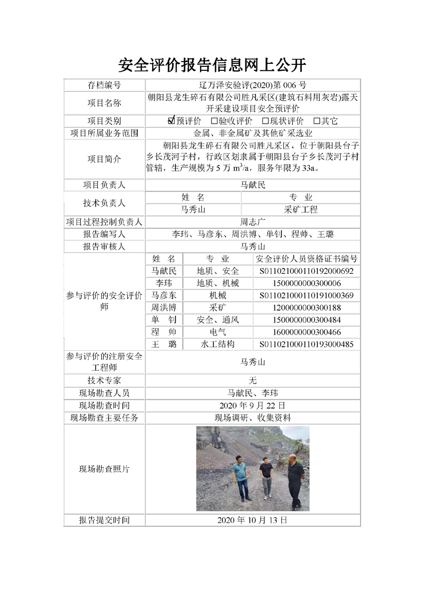 朝阳县龙生碎石有限公司胜凡采区(建筑石料用灰岩)露天开采建设项目安全预评价