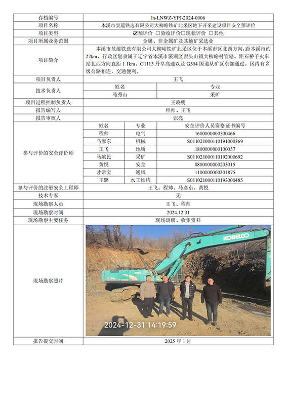 本溪市昱蕴铁选有限公司大柳峪铁矿北采区地下开采建设项目安全预评价