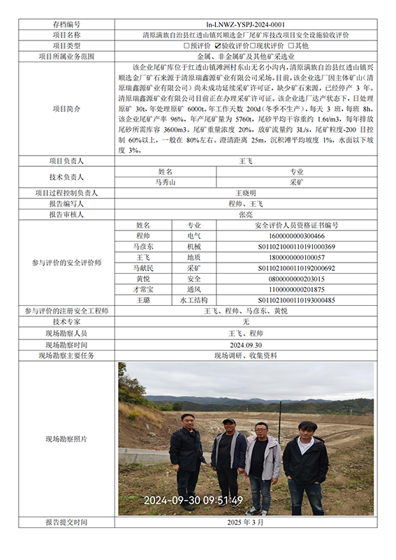 清原满族自治县红透山镇兴顺选金厂尾矿库技改项目安全设施验收评价