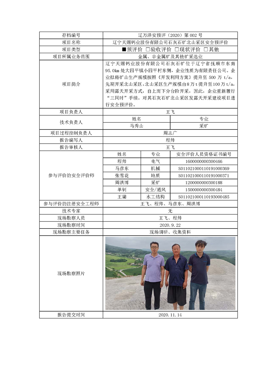 辽宁天赐钙业股份有限公司石灰石矿北山采区安全预评价