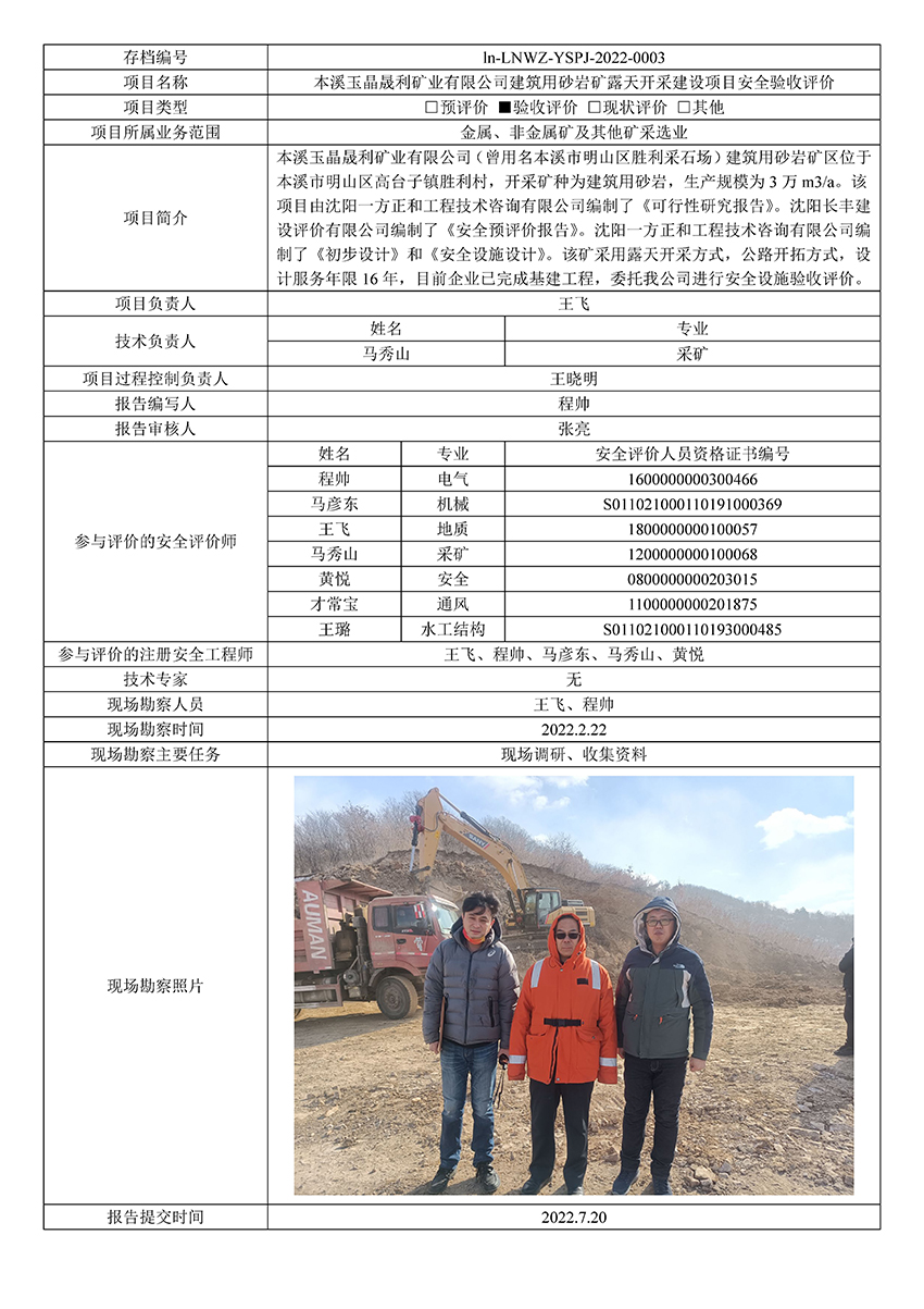 本溪玉晶晟利矿业有限公司建筑用砂岩矿露天开采建设项目安全验收评价