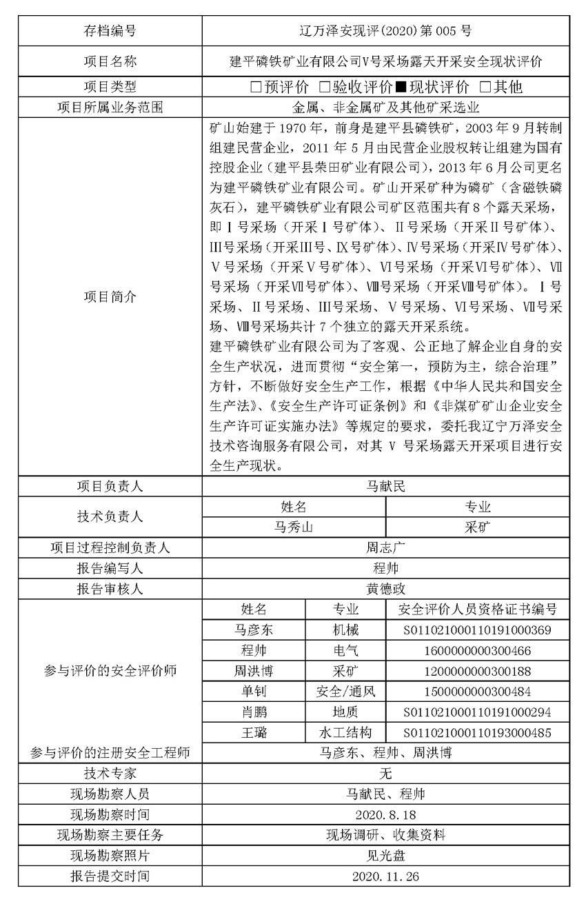建平磷铁矿业有限公司V号采场露天开采安全现状评价
