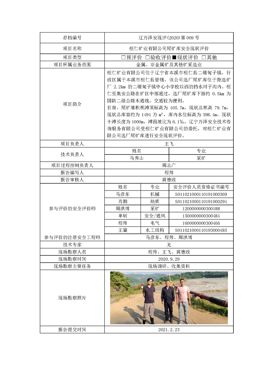 桓仁矿业有限公司选厂尾矿库安全现状评价