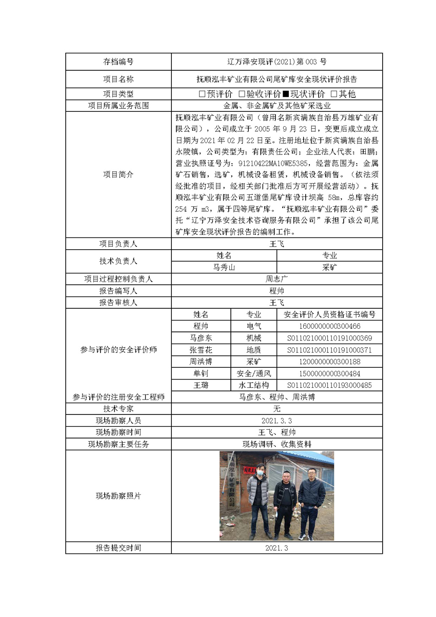 抚顺泓丰矿业有限公司尾矿库安全现状评价报告