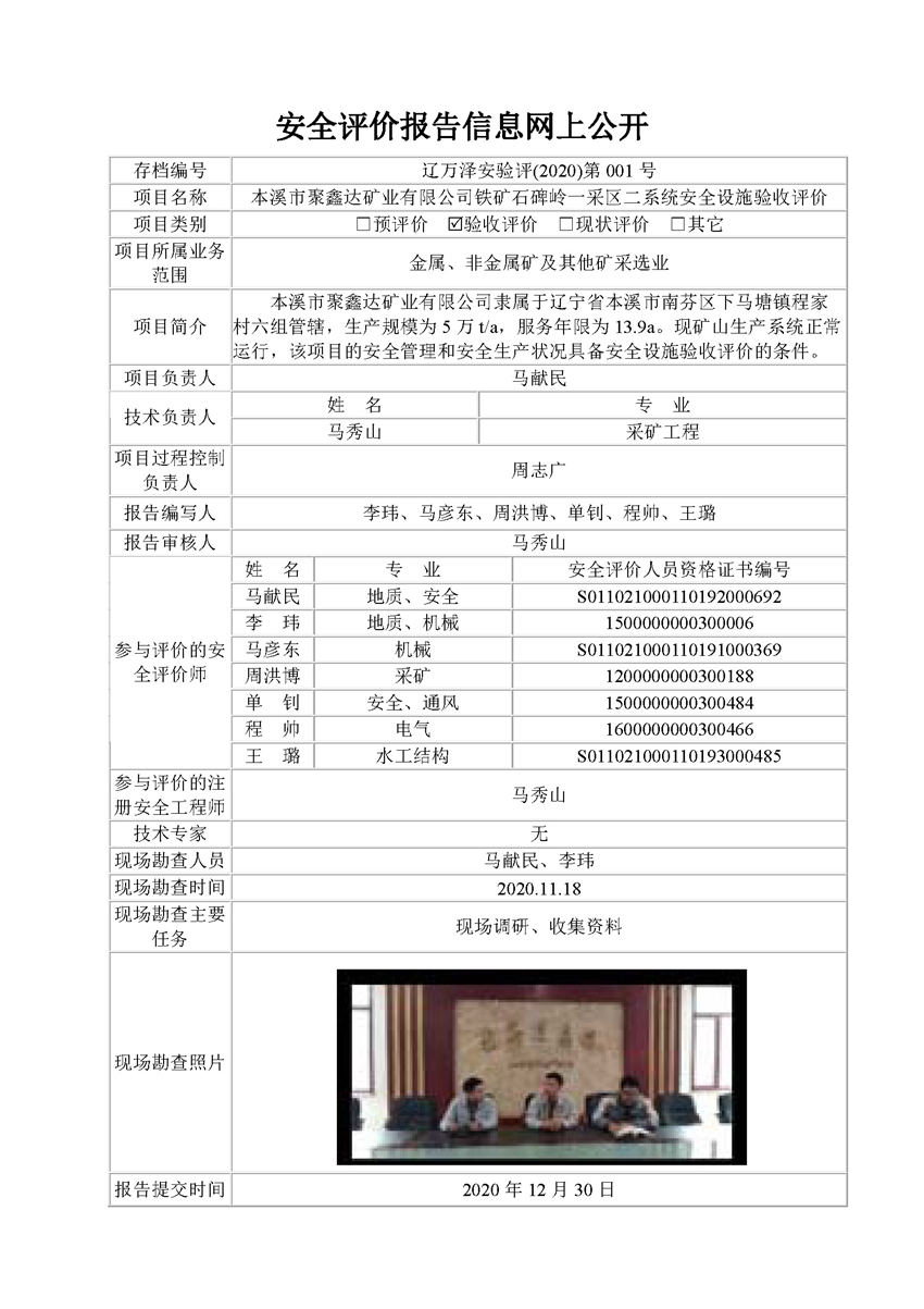 本溪市聚鑫达矿业有限公司铁矿石碑岭一采区二系统安全设施验收评价