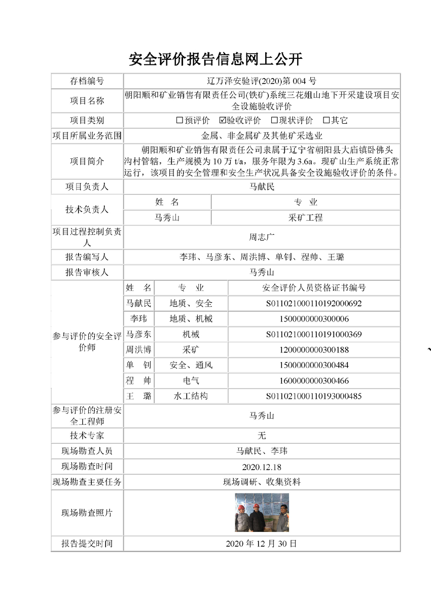 朝阳顺和矿业销售有限责任公司(铁矿)系统三花姐山地下开采建设项目安全设施验收评价