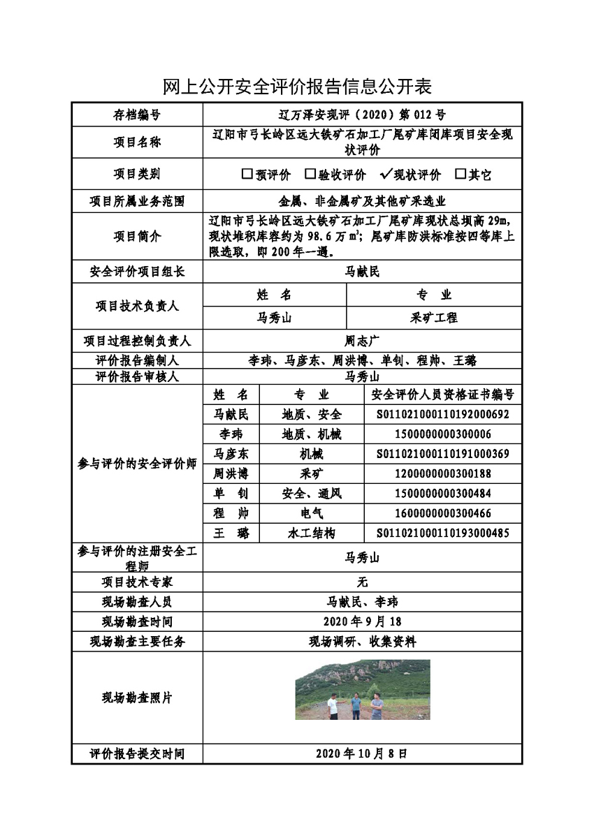 辽阳市弓长岭区远大铁矿石加工厂尾矿库闭库项目安全现状评价