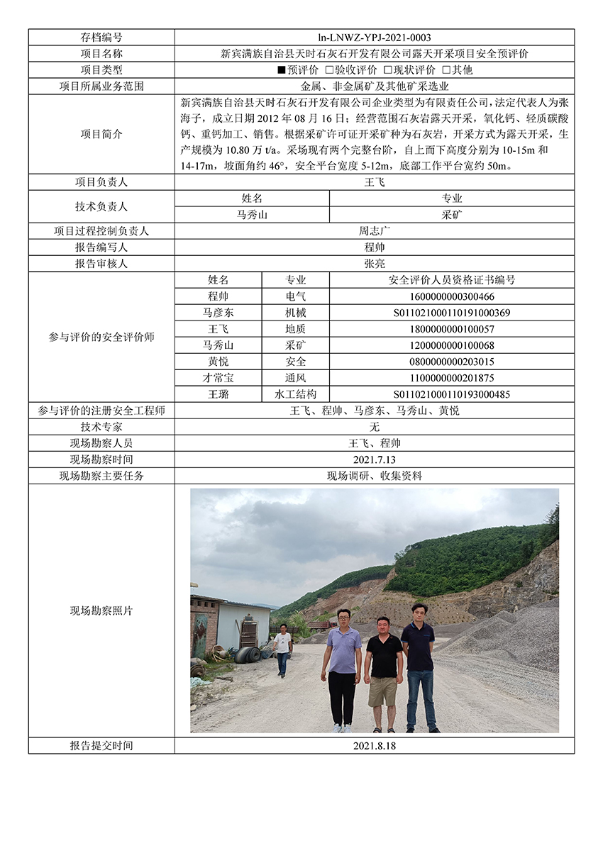 新宾满族自治县天时石灰石开发有限公司露天开采项目安全预评价