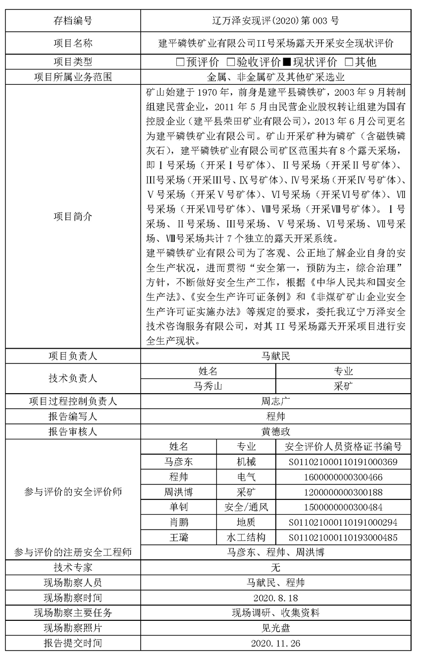 建平磷铁矿业有限公司II号采场露天开采安全现状评价