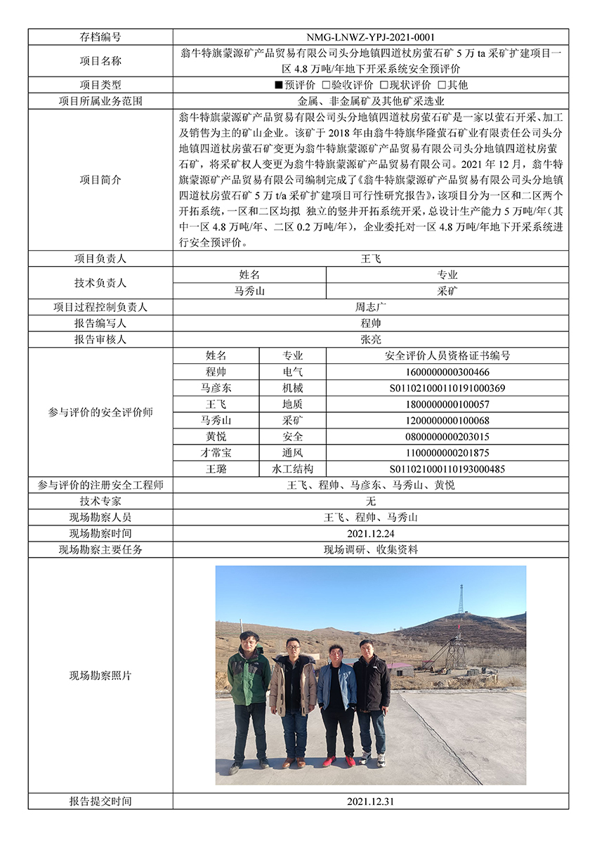 翁牛特旗蒙源矿产品贸易有限公司头分地镇四道杖房萤石矿5万ta采矿扩建项目一区4.8万吨/年地下开采系统安全预评价