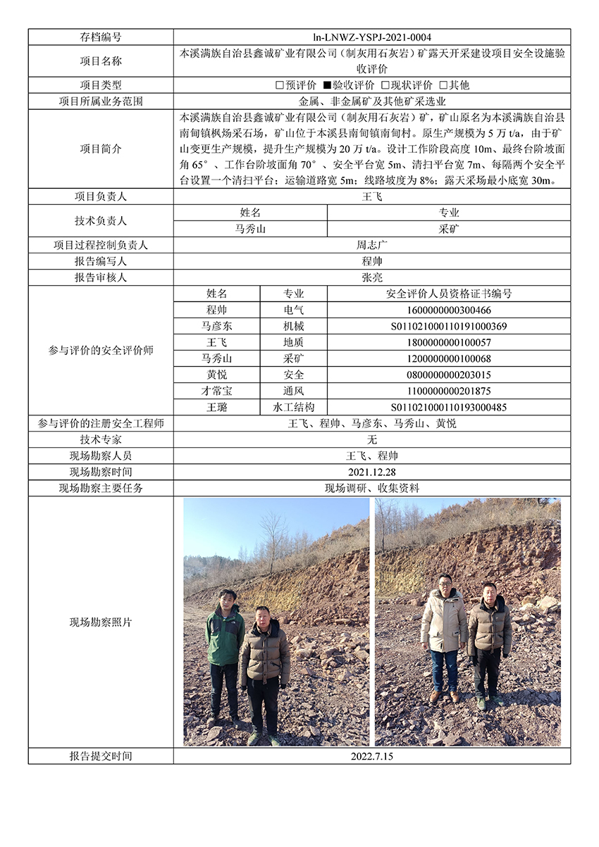 本溪满族自治县鑫诚矿业有限公司(制灰用石灰岩)矿露天开采建设项目安全设施验收评价