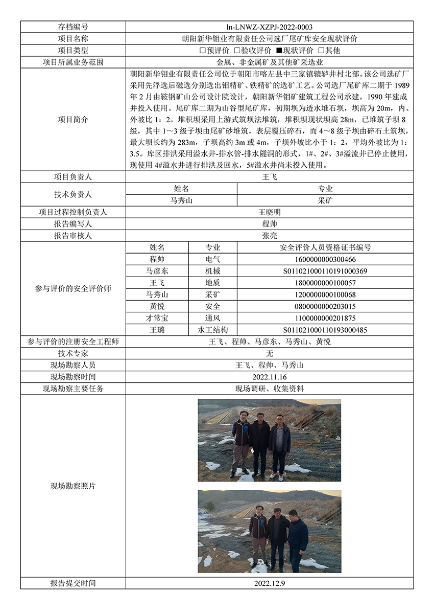 朝阳新华钼业有限责任公司选厂尾矿库安全现状评价