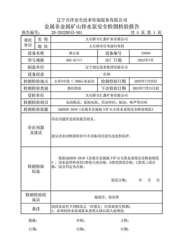 | 受检单位 | 大石桥市汇鑫矿业有限公司 | |