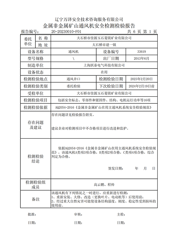 | 受检单位 | 大石桥市佳源玉石菱镁矿业有限公司 | |