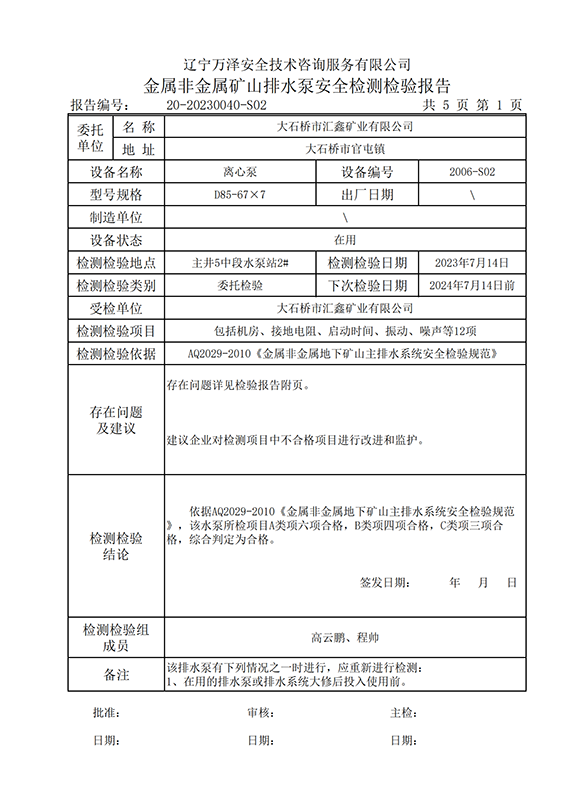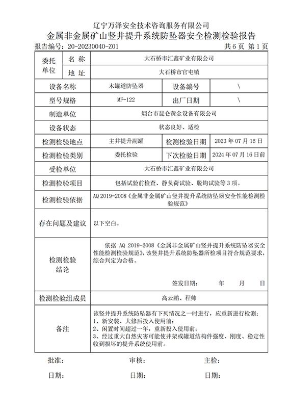 | 受检单位 | 大石桥市汇鑫矿业有限公司 | |