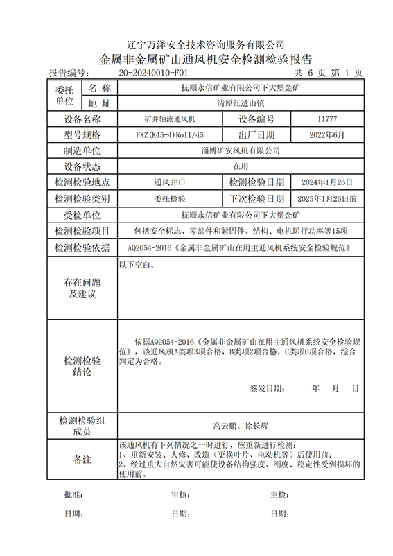 | 受检单位 | 20-20240010抚顺永信矿业有限公司下大堡金矿 | |