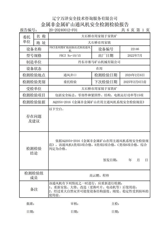 | 受检单位 | 20-20240012大石桥市周家镇于家铁矿 | |