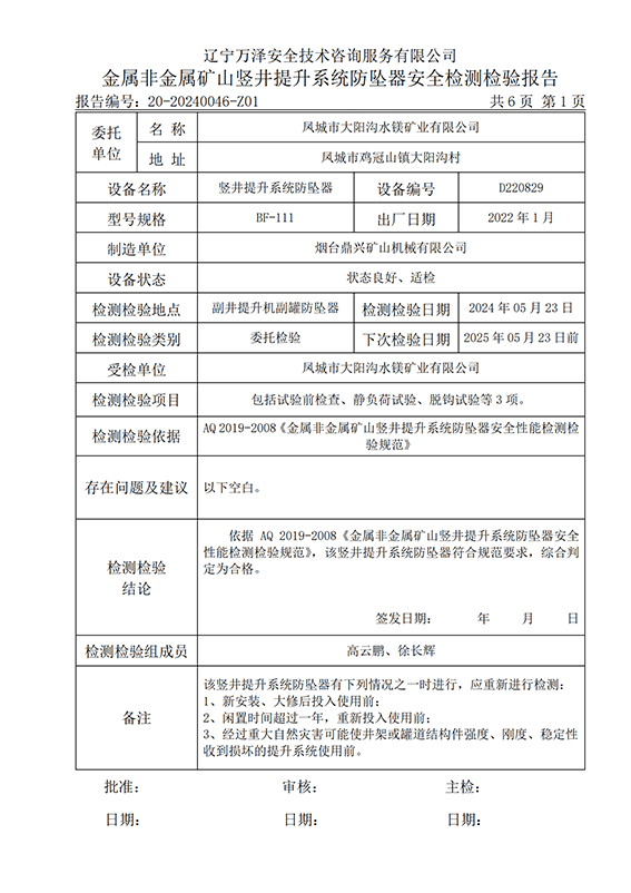 | 受检单位 | 20-20240046凤城市大阳沟水镁矿业有限公司 | |