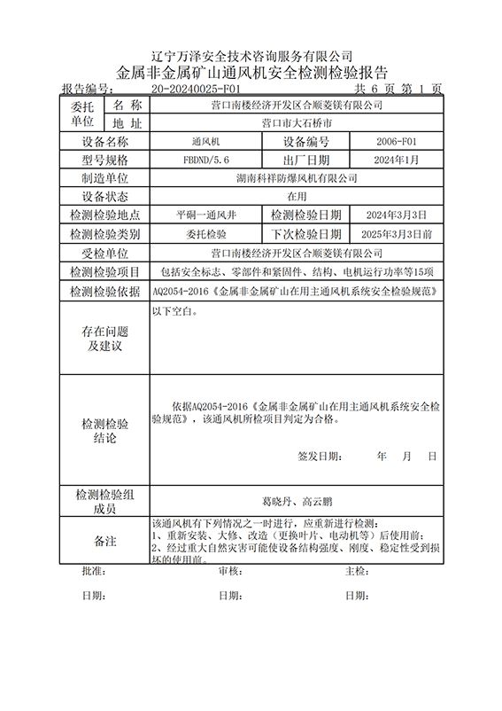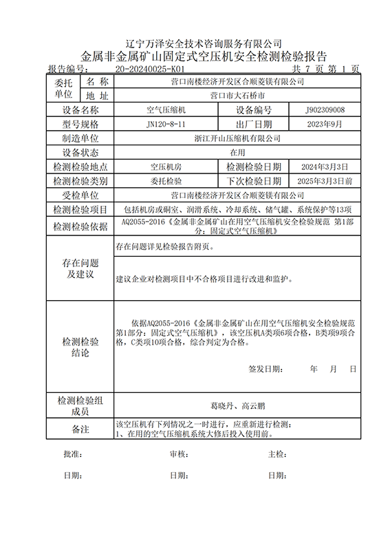 | 受检单位 | 20-20240025营口南楼经济开发区合顺菱镁有限公司 | |