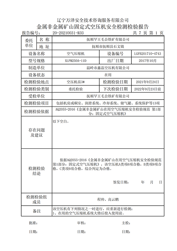 | 受检单位 | 抚顺罕王毛公铁矿有限公司 | |
